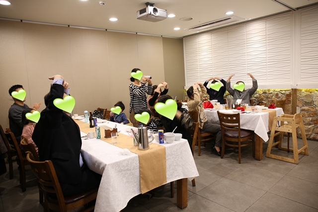 이지아 아기의 첫 돌을 축하하며 모인 가족, 지인들이 손을 머리 위로 크게 들어올려서