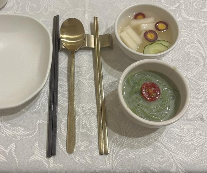 첫 번째로 검 콩국수와 물김치가 나왔어요.