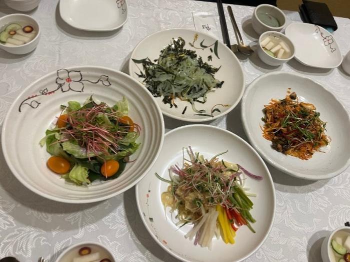 샐러드, 청포묵 무침, 고동 무침, 해파리 무침이 나왔어요.