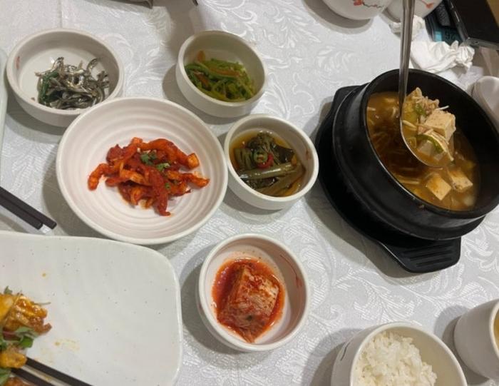 요리가 끝나고 된장찌개와 밥, 김치, 장아찌, 무말랭이, 호박나물, 멸치볶음이 나왔어요.