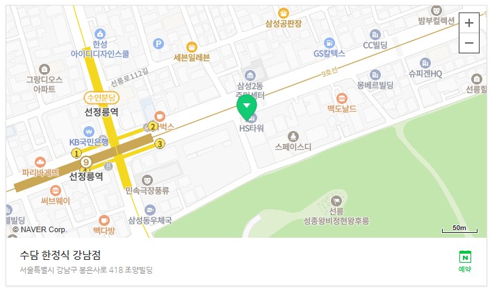 수담한정식 강남점은 선정릉역 3번 출구에서 도보 1분 거리에 위치하고 있습니다